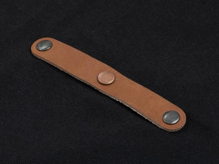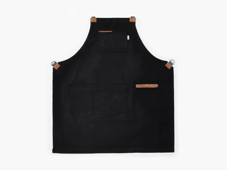 Chef Grilling Apron. Dit kookschort is een onmisbare accessoire voor in de keuken, rond het kampvuur, de buitenkeuken of de BBQ. Modern asymetrisch ontwerp. Zwaar stevig zwart katoen. Slijtvast. Leren details. Verstelbare kruisbanden op de rug. One size fits all. Leren zakje voor pen of thermometer. Leren riem om keukendoek of kookgereedschap.
