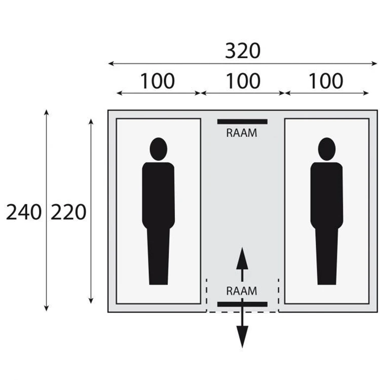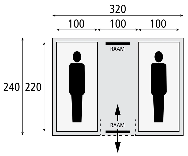 De twee slaapcabines hebben een afmeting van 220 x 100 cm. Deze cabines bieden elk ruimte voor slechts een persoon. Tussen de twee cabines is het leefgedeelte met een afmeting van 240 x 100 cm. De tent heeft op het hoogste punt een hoogte van 130 cm. Het leefgedeelte is aan beide kanten voorzien van ramen waarvan één zijde ook als deur fungeert. Hierdoor is er voldoende lichtinval waardoor de tent ruimer lijkt. In het leefgedeelte kunt u ook uw bagage netjes bewaren.